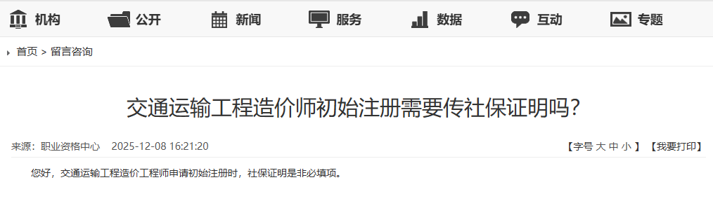 近日有网友咨询:交通运输工程造价师初始注册需要传社保证明吗?