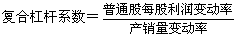 对复合杠杆计量的主要指标是复合杠杆系数或复合杠杆度。复合杠杆系数是指普通股每股利润变动率相当于产销量变动率的倍数。其计算公式为: