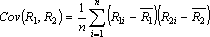 式中,Cov(R1,R2)为投资于两种资产收益率的协方差,R1i为在第i种投资结构下投资于第一种资产的投资收益率,为投资于第一种资产的期望投资收益率,R2i为在第i种投资结构下投资于第二种资产的投资收益率,R2为投资于第二种资产的期望投资收益率,n为不同投资组合的种类数。