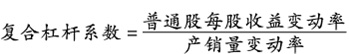 对复合杠杆计量的主要指标是复合杠杆系数或复合杠杆度。复合杠杆系数,是指普通股每股收益变动率相当于产销量变动率的倍数。其计算公式为: