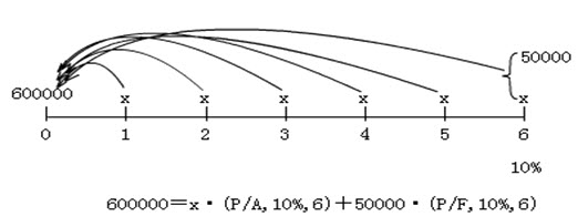 每年租金=[600 000-50 000×(P/F,10%,6)]/(P/A,10%,6)=131283(元)