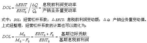 式中:EBIT:息税前利润;S:销售额;V:变动性经营成本;F:固定性经营成本;Q:产销业务量;P:销售单价;VC:单位变动成本;M:边际贡献。