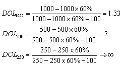 【例5-14】 某企业生产A产品,固定成本100万元,变动成本率60%,当销售额分别为1000万元,500万元,250万元时,经营杠杆系数分别为: