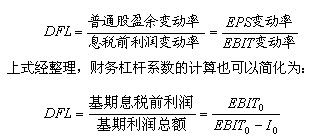 只要企业融资方式中存在固定性资本成本,就存在财务杠杆效应。测算财务杠杆效应程度,常用指标为财务杠杆系数。财务杠杆系数(DFL),是普通股盈余变动率与息税前利润变动率的倍数,计算公式为:
