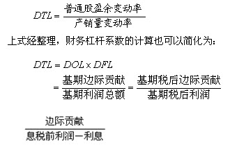 只要企业同时存在固定性经营成本和固定性资本成本,就存在总杠杆效应。总杠杆系数是经营杠杆系数和财务杠杆系数的乘积,是普通股盈余变动率与产销量变动率的倍数,计算公式为: