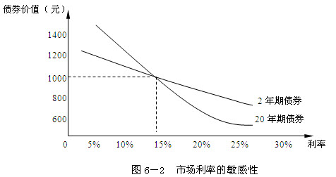 将表6-17中债券价值对市场利率的函数描述在图6-2中,并结合表6-16的数据,可以得出如下结论: