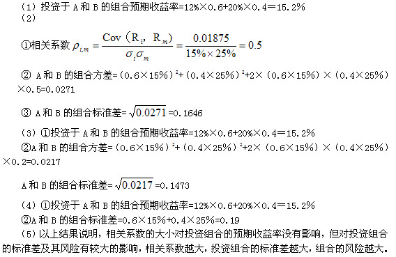 (3)如果A、B的相关系数是0.2,计算投资于A和B的组合预期收益率与组合标准差。
