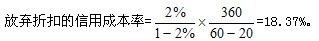 【例题64·单选题】某公司按照2/20,N/60的条件从另一公司购入价值1000万元的货物,由于资金调度的限制,该公司放弃了获取2%现金折扣的机会,公司为此承担的信用成本率是( )。