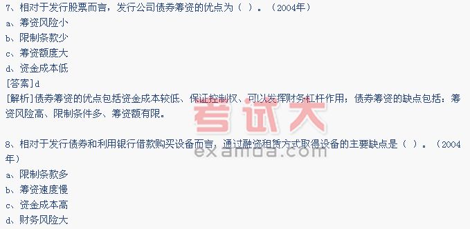 [解析]融资租赁筹资的最主要缺点就是资金成本较高。一般来说,其租金要比举借银行借款或发行债券所负担的利息高得多。在企业财务困难时,固定的租金也会构成一项较沉重的负担。