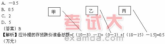 03年考题:某企业采用成本与可变现净值孰低法对存货进行期末计价,成本与可变现净值按单项存货进行比较。2002年12月31日,甲、乙、丙三种存货成本与可变现净值分别为:甲存货成本10万元,可变现净值8万元;乙存货成本12万元,可变现净值15万元;丙存货成本18万元,可变现净值15万元。甲、乙、丙三种存货已计提的跌价准备分别为1万元、2万元、1.5万元。假定该企业只有这种存货,2002年12月31日应补提的存货跌价准备总额为( )万元。(2003年)