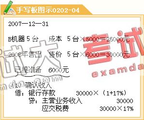 【例2】2007年末甲公司库存B机器5台,每台成本为5 000元,已经计提的存货跌价准备为6 000元。2008年,甲公司将库存的5台机器全部以每台6 000元的价格售出。假定不考虑可能发生的销售费用及税金的影响,甲公司应将这5台B机器已经计提的跌价准备在结转其销售成本的同时,全部予以结转。