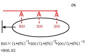 500/(1+6%)+300/〔(1+6%)(1+6%)〕+200/〔(1+6%)(1+6%)(1+6%)〕