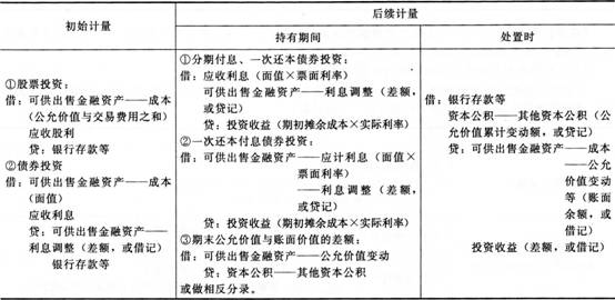 可供出售金融资产二级明细科目有:成本、利息调整、公允价值变动、应计利息、减值准备。其中“成本”二级科目核算的是债券的面值或股权投资的公允价值和直接相关费用之和;“利息调整”二级科目反映的是债券投资的溢折价以及佣金、手续费等相关费用;“公允价值变动”科目反映的是资产负债表日公允价值与账面余额的差额;“应计利息”科目反映的是一次还本付息债券计提的利息。