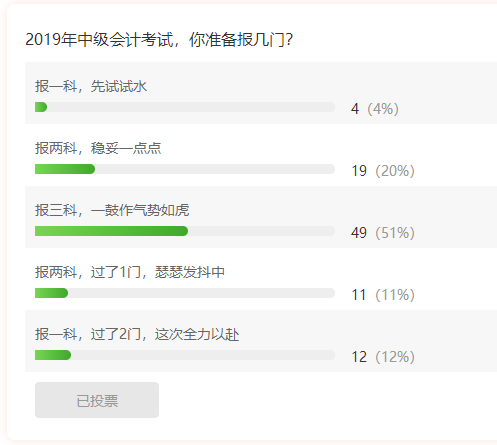 2019年中级会计师报名已经完全结束了,据233网校社区投票的不完全统计,2019年中级会计师报考中51%的同学选择了一次报考三科,20%的同学选择了稳妥两年过三科,不知道你们呢?一起来投票看看备考路同行的你们是怎么报考的!