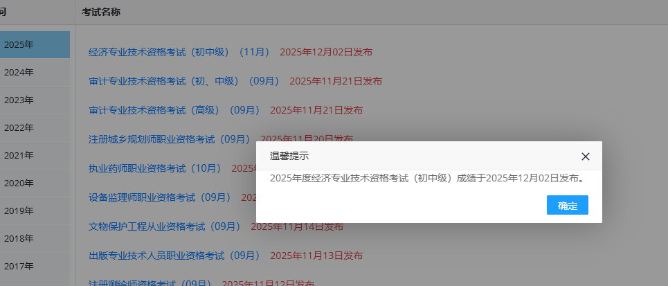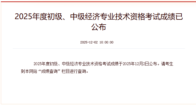 2025年度初级、中级经济专业技术资格考试成绩于2025年12月2日公布。请考生到本网站“成绩查询”栏目进行查询。