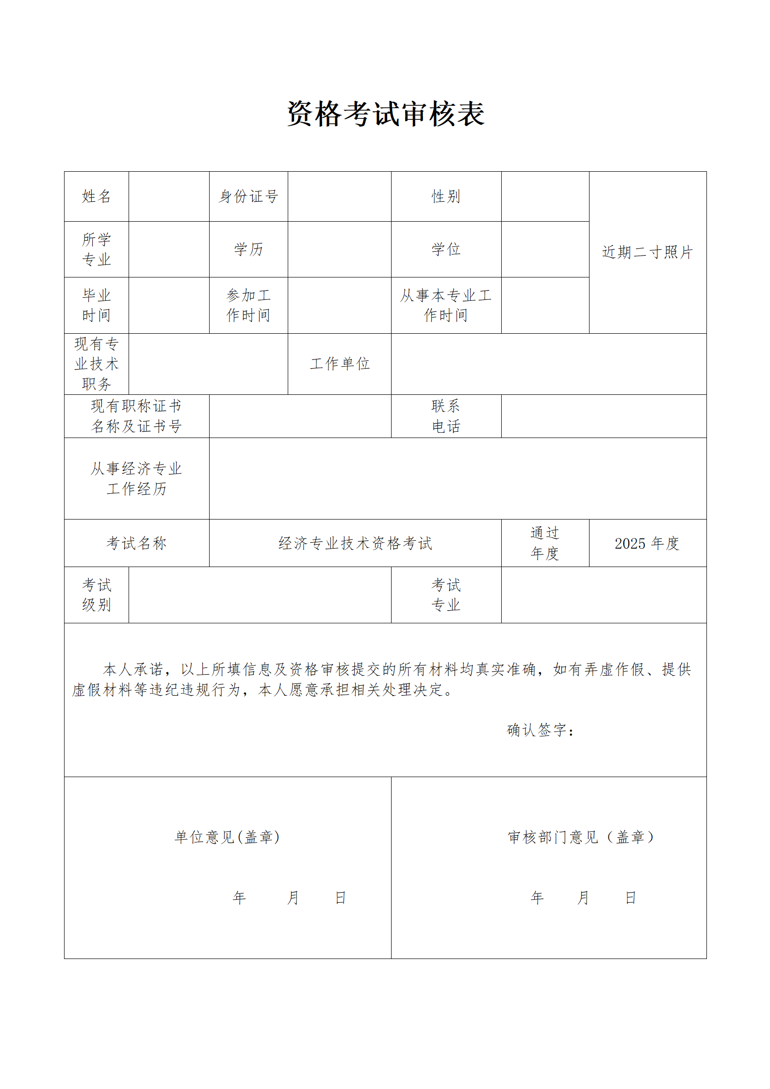 (一)《资格考试审核表》一式两份,由本人自行下载并填写,由所在单位签署意见加盖印章。