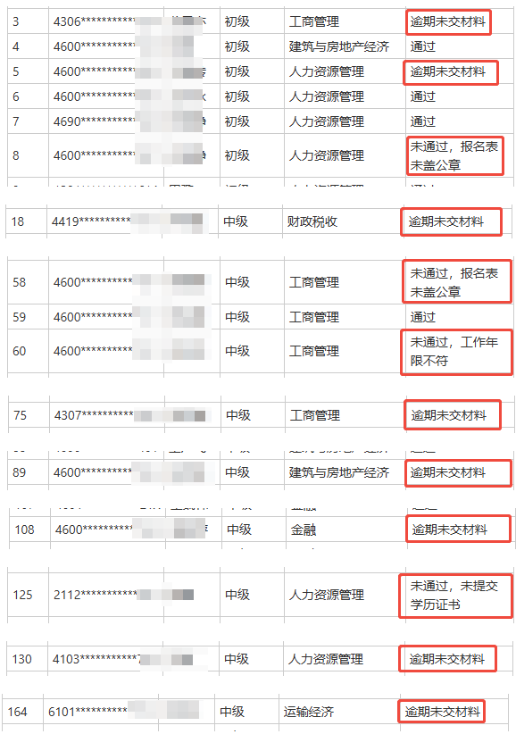 海南2025年初中级经济师资格复核结果公示,有8人逾期未交材料,有4人未通过审查(2人报名表未盖公章,1人工作年限不符,1人未提交学历证书)。