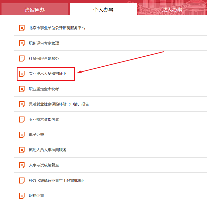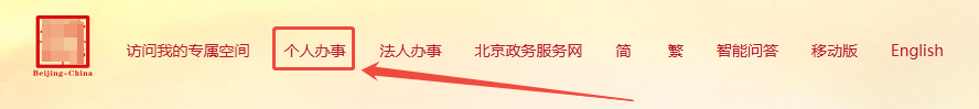 第一步:进入北京市人力资源和社会保障局网站,找到最顶部的小字导航,找到【个人办事】。