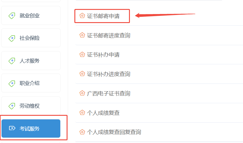 https://link.233.com/37916/si/#/modules/person/person)选择考试服务→证书邮寄申请,按要求填写本人邮寄地址等信息完成证书申领登记(免付邮费);也可通过广西人事考试网(http://link.233.com/15009)→证书领取→证书发放系统入口登录广西壮族自治区“数智人社”政务服务大厅并按以上操作步骤完成本人证书申领登记。(考试服务使用帮助可查阅:考试服务使用手册)。