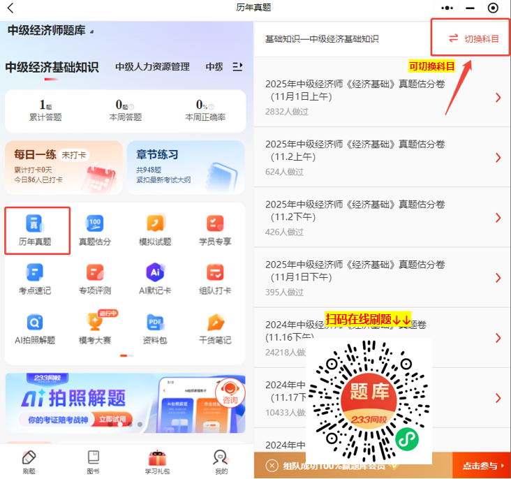其中233网校题库的适配性尤为突出,通过以下方式,可在233网校刷中级经济师历年真题: