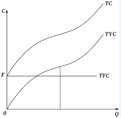 2、总成本曲线TC | (1)从纵轴一个截点即产量为0时总成本等于固定成本的那个点F开始。 (2)随产量的增加而逐步上升,开始时以递减的增长率上升,当产量达到一定水平之后,便以递增的增长率上升。 |
