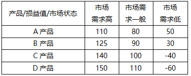 某奶粉生产企业将目标顾客定位于老年购买群体,专门生产适合老年人体制的奶粉,取得了良好的市场效果。为了降低成本,该企业建立奶牛养殖基地,自助供应奶源。为了提升产品竞争力,该企业与国际知名奶粉生产企业建立战略,共同研发新型奶粉产品。该新型奶粉共有A产品、B产品、C产品、D产品四种开发方案可供选择,每种产品方案均存在着市场需求高、市场需求一般、市场需求低三种可能的市场状态,但各种状态发生的概率单一测算。在市场调查的基础上,该奶粉生产企业对四种备选方案的损益值进行了预测,在不同市场状态下损益值如下表所示(单位:百万元):