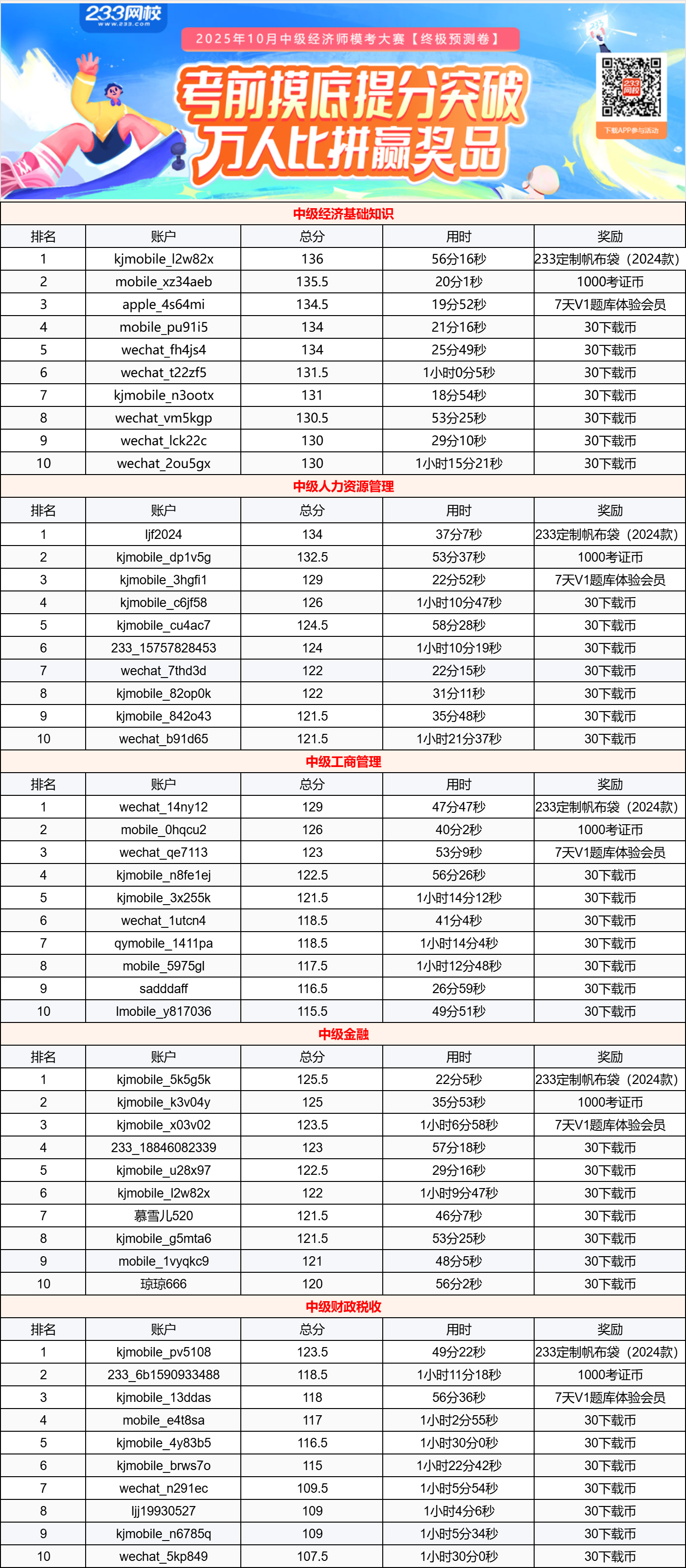 25年10月初、中级经济师模考大赛获奖名单TOP10