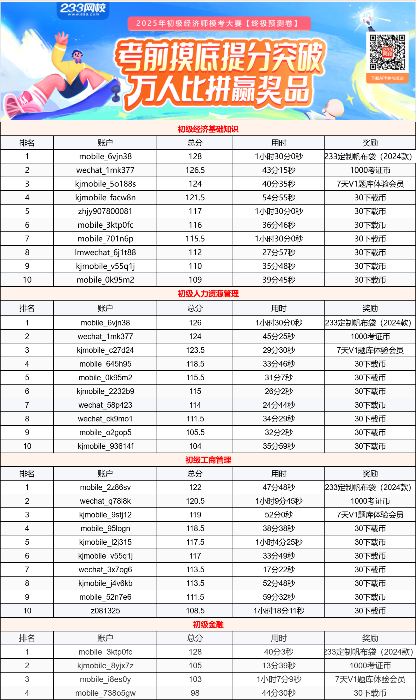 2025年10月初、中级经济师模考大赛《终极预测卷》(第二期)完美结束啦!!临近考前最后2周,快来一起看看大家的实力吧!当然,考证币、V题库会员、下载币等奖品,已经发放到各位的账户了!获得【帆布袋】的考生,请及时登录【233网校APP】——题库——模考大赛——我的奖品,完成地址填写,我们仓库将会统一发货!
