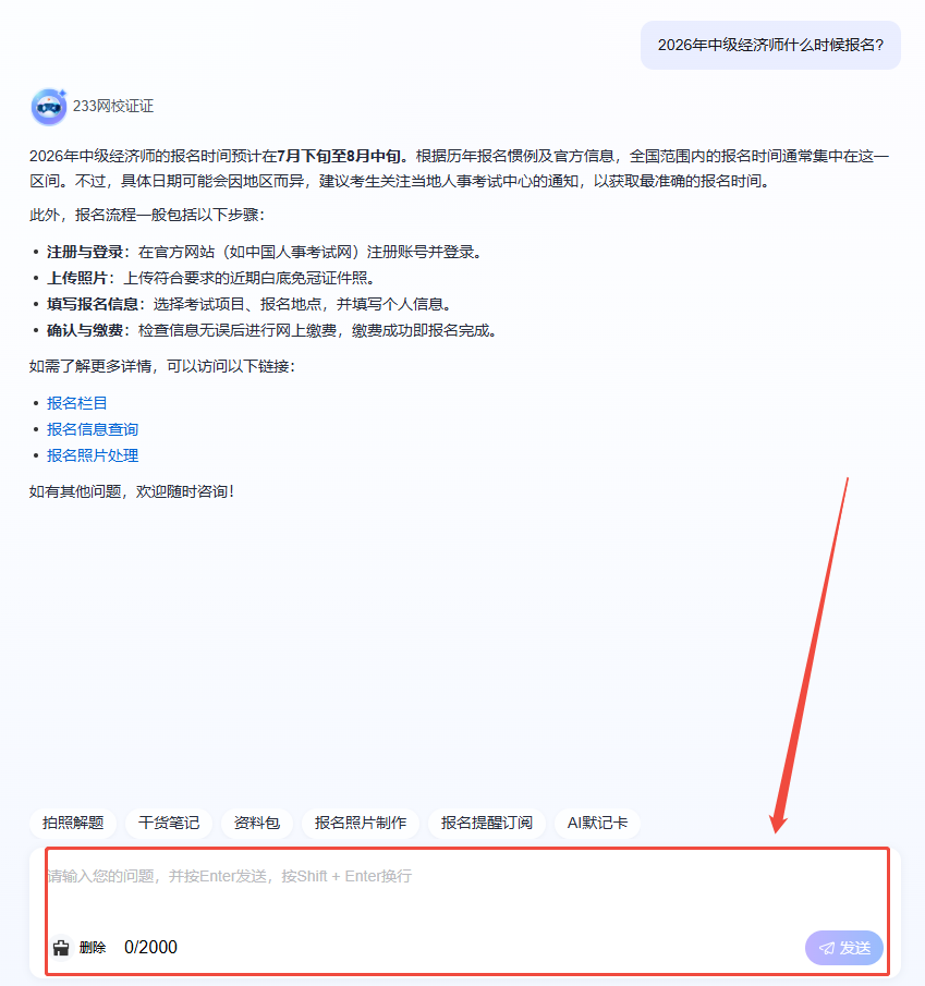 从“何时报名,如何报名?”“是否符合报名条件?”,到 “专业怎么选择?”“报考信息怎么填写”等,中级经济师考试疑问分散,搜索筛选耗时费力。AI 智能报考助手懂中级经济师考试,无论考试科目、报名细节,还是报考规则,都能为你解决困惑,实时给出专业解答。无需四处拼凑信息、等待人工回复,疑问随时抛给 AI,即刻获得清晰指引。输入你的报考疑难问题,AI报考助手即刻给你答案,马上体验>>