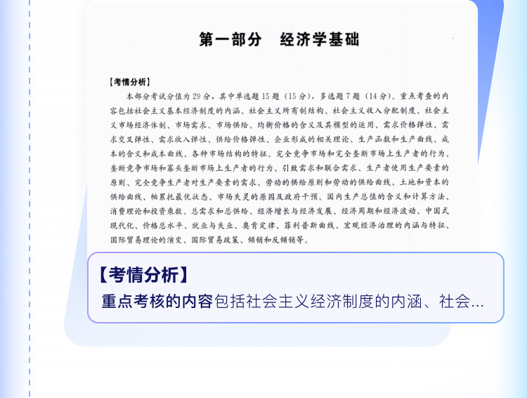 书籍按 6 大类框架梳理内容,每个章节前都附 “考情分析”:明确该章分值占比、高频考点清单,比如 “经济学基础” 章节直接告诉你单选 15 题、多选 7 题,重点考 “社会主义经济制度”“市场供求” 等内容。先摸清考试重点,再针对性刷题,避免盲目啃偏题、怪题。