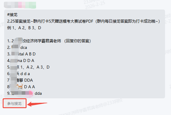你需要在群内接龙分享你的答案,累计参与接龙打卡5天,赠送模考大赛试卷PDF版!