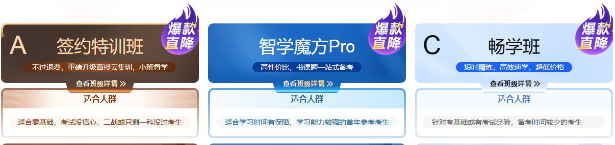233网校中级经济师培训打造了完善的课程体系,覆盖预习、基础、强化、冲刺全备考阶段,同时设置了多种班型,价格从几百元到千元不等,适配不同基础、不同备考需求的考生。其中,签约特训班适合零基础、二战或备考信心不足的考生,提供不过退费或重学保障,搭配面授云集训、小班督学等服务;智学魔方Pro适合学习时间充足、自学能力较强的首年考生,主打书课题一站式备考,提供免费重学一次的保障;畅学班则适合有基础、备考时间较少的考生,课程精简高效,可任选7个科目搭配学习,性价比突出。所有课程均会根据每年考试大纲变化及时更新,确保授课内容贴合最新考试要求。
