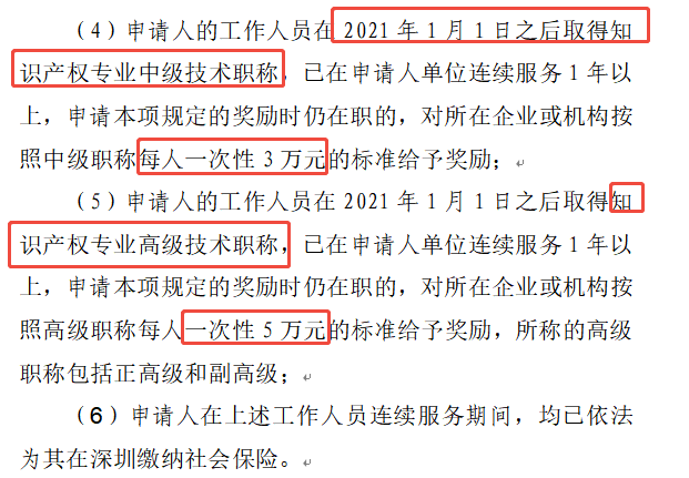 依法登记注册的深圳企事业单位、高校院所、科研机构或知识产权服务机构的工作人员,2021 年 1 月 1 日之后在深圳取得中级知识产权师职称,且在单位连续服务 1 年以上(申请时仍在职)、所在单位依法为其缴纳深圳社保的,可由所在单位申报一次性奖励 3 万元;取得高级知识产权师职称(含正高级、副高级),且满足上述相同服务及社保要求的,可由所在单位申报一次性奖励 5 万元。