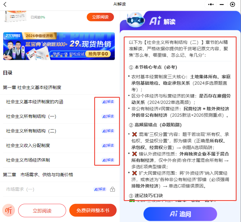 笔记融入AI总结功能,依托智能技术对繁杂的知识点进行梳理、提炼和整合,将零散的考点系统化、条理化,剔除无关内容,保留核心要点。对于中级经济师《经济基础知识》37章繁杂知识点以及专业科目中的实务考点,AI总结能够帮助考生快速抓住重点,理清知识脉络,避免陷入“盲目背诵、记不住”的困境。