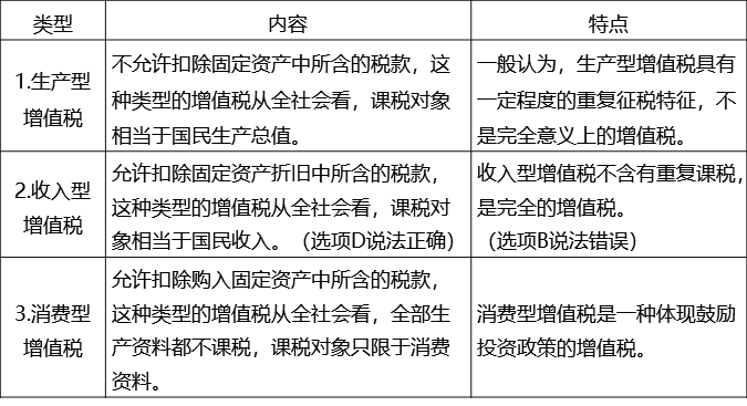 选项C错误;"生产型”增值税 ,即不允许扣除固定资产中所含的税款,这种类型的增值税从全社会看,课税对象相当于国民生产总值,故称为“生产型”增值税 。一般认为,“生产型”增值税具有一定程度的重复征税特征 ,不是完全意义上的增值税;
