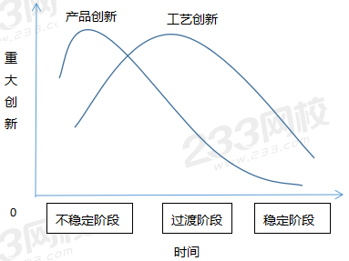 ①产品创新和工艺创新均呈上升趋势,但产品创新明显强于工艺创新,这是产业发展的初期阶段。 ②创新的重点是进行新产品的设计与开发。 ③是在商业和技术不断“尝试、纠错”的阶段。 ④研究开发具有探索性,研发经费支出较高,不易获得好的经济效益。 |