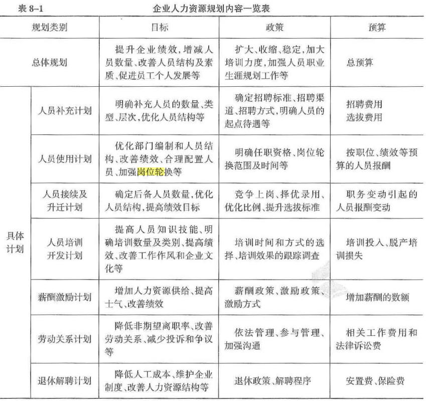 人力资源规划:指企业根据发展战略、目标和任务的要求,科学地预测与分析企业在不断变化的环境中人力资源的需求和供给状况,并据此制定必要的人力资源政策和措施,以确保企业的人力资源与企业的发展战略、目标和任务在数量、质量、结构等方面保持动态平衡的过程 。