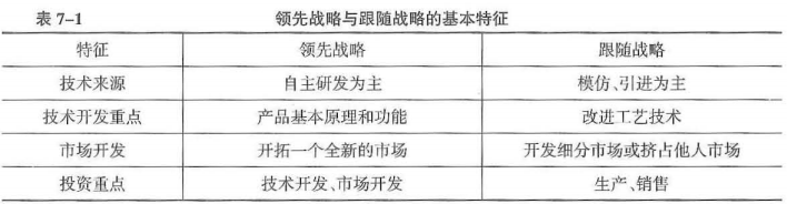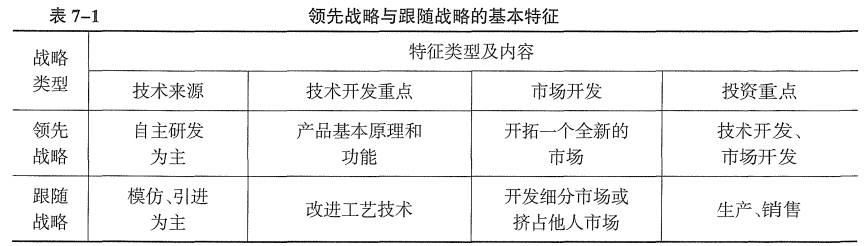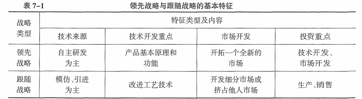 (1)技术领先战略:致力于在相关技术领域占据领导地位,在所有竞争者之前,率先采用新技术,并使新产品最早进入市场,成为同行业的“领头羊”,获取较大的市场占有率和利润。 (2)技术跟随战略:指企业不图领先,而是在领先者的创新获得进展以后,学习领先者创造的知识,跟在领先者后面进行模仿 。 |