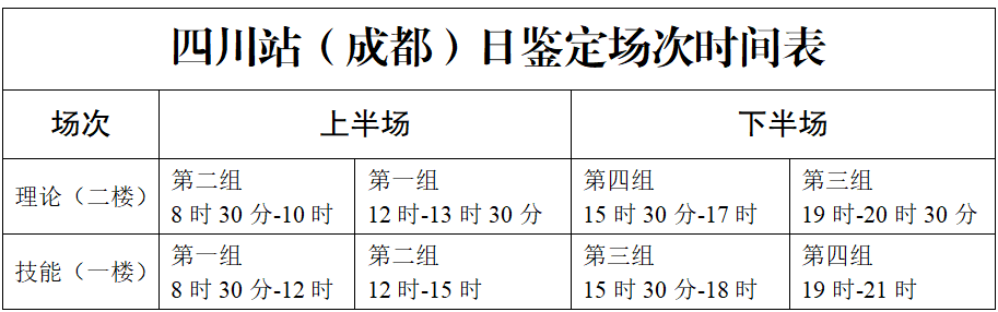 按照准考证上“理论考试时间”准时到场(技能考试时间显示为“机动”),到场后服从现场安排,全部科目当日内考完,具体鉴定场次时间参见下表。