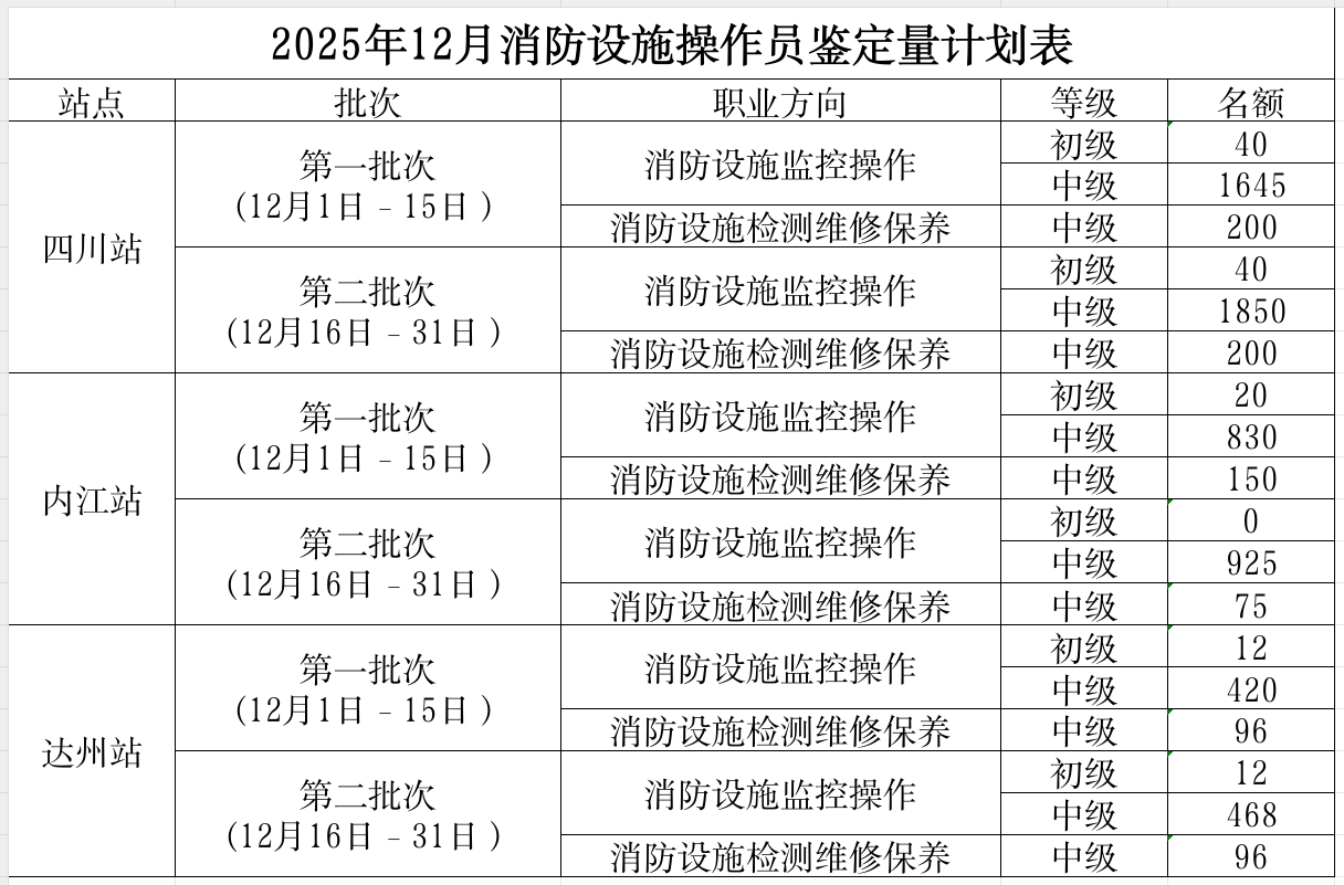 原文标题:四川省消防救援总队消防行业职业技能鉴定站2025年12月消防设施操作员职业技能鉴定考试公告