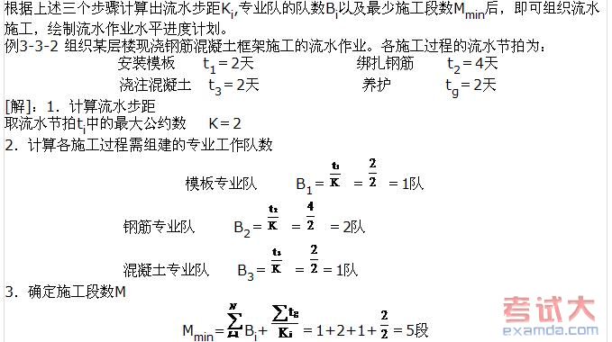 (3)计算施工段数。根据流水作业的原则,施工段数m至少要等于施工过程数n。在成倍节拍流水中,由于各施工过程的流水节拍不同,流水节拍大的施工过程需要增加专业工作队。因此,少施工段数要根据参加流水的专业工作队数来定。其算式如下: