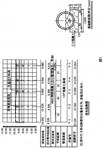 如图1、图2为某市道路排水工程施工图。该路段排水为雨污合流管,排水管位于道路中心线南、北两侧各15.0m处,其管道采用φ800钢筋混凝土企口管(Ⅱ、Ⅲ级管),管段长2m,管道接口采用钢丝网水泥砂浆抹带接口,管道铺设采用人机配合;钢筋混凝土管基础采用120℃15商品混凝土基础,模板采用组合钢模板;检查井规格为井内径2000mm。
