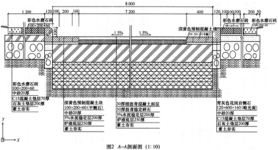 13、 根据图1、图2和2013年《全国统一市政工程预算定额河北省综合基价》,按上题计算的工程量,彩色水磨石砖单价为每平方米80元,沥青混凝土每立方米960元,便道商品混凝土垫层C15—40,沥青面层按机械带自动找平铺设,完成沥青混凝土面层工程量清单及报价,并分析综合报价。