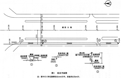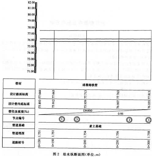 图1、图2为某市给水管道工程施工图。管道采用K9系列DN400壁厚8.1mm球墨铸铁给水管,胶圈接口;管沟土方为三类土,采用人工挖土方式,不考虑各种井室所增加开挖的土方工程量,外运土运距为3km。请用工料单价法计算桩号0+130~0+300段的下列工程量。