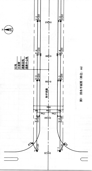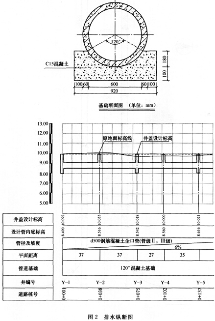 1.图1、图2为某市道路排水工程施工图。该路段排水为雨污合流管,排水管位于道路中心线南、北两侧各12.0m处,其管道采用d600钢筋混凝土企口管(Ⅱ、H1级管),检查井规格为井内径1250mm。