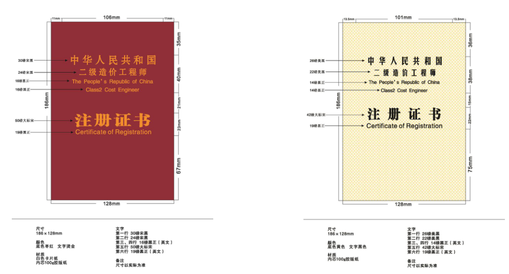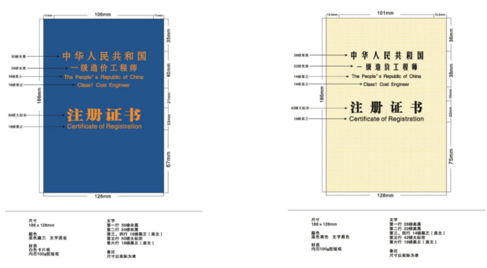 (三)造价工程师执业印章的字体要求:造价工程师注册级别为四号宋体,姓名为二号隶书,执业印章编码为小三号Arial字体,聘用单位名称及印章的有效期为小五号宋体;