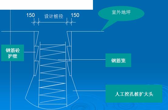 采用人工挖成桩孔,安放钢筋笼,灌注砼形成砼桩基。