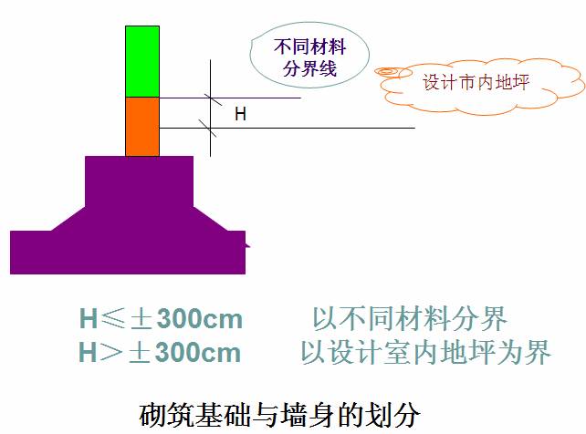若砌筑基础与墙身采用不同材料,交界处位置位于设计室内地坪±300mm以内时,以不同材料分界,超过±300mm时,仍以设计室内地坪为界。