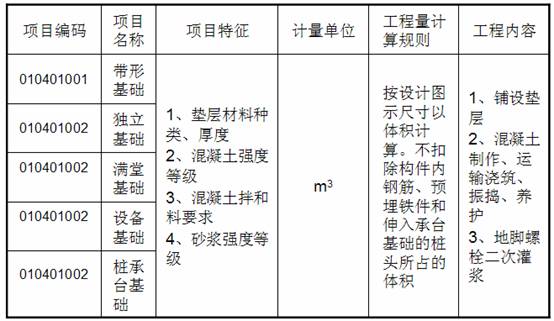 按基础形体和作用划分设置,共五个清单项目,编码为010401001---010401005,其名称、单位、工程量计算规则以及项目特征、工程内容见表: