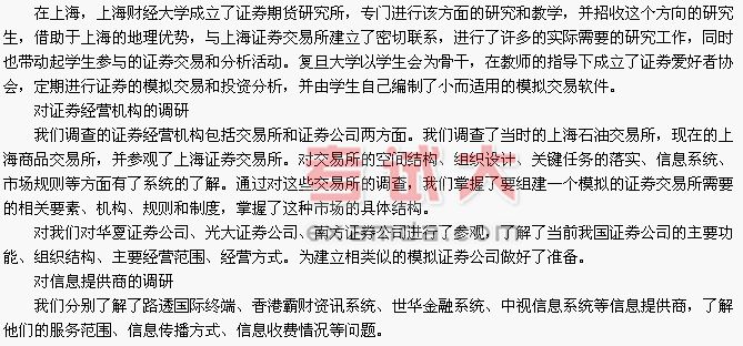我们先后走访了北京物资学院、中国对外经济贸易大学、清华大学、中国人民大学、上海财经大学、复旦大学、中国金融学院等高校,了解了以上高校对金融和证券类课程实践环节教学的想法、态度和做法。